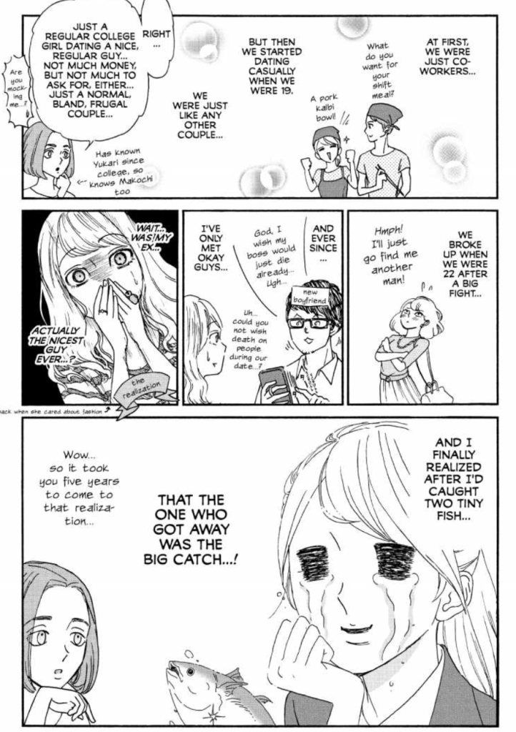 Before I met my husband, I was a himono onna (干物女) like Hotaru. Himono means “dried fish”, so himono onna is a “dried fish woman”. It’s a term for women who are not interested in dating or having children. They put on a perfect face at work, but go home and laze around. Hotaru’s Way is a great title that explores Hotaru’s anxieties and what’s led her to lead her life as a himono onna, as well as the stress of switching from living life solely for yourself to taking on a dating life and all of its messiness. It’s funny, but also heartfelt and sympathetic. It’s an older title, which definitely paved the way for titles that deal with the topic of single life with care.