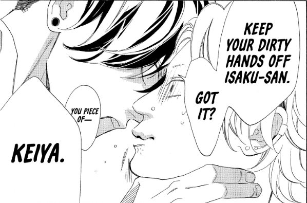 There are a lot of flashbacks to the family dynamic the pair has had, which makes many readers uncomfortable- it’s different from similar stories wherein there’s an age gap, but the romantic leads meet because the man has been hired to protect the girl when she’s sixteen or older. This plot point borders on incestuous for some readers and has a grooming element. Keiya borders into the yandere territory as the story progresses. It becomes very clear that Keiya has an extreme obsession with Isaku.